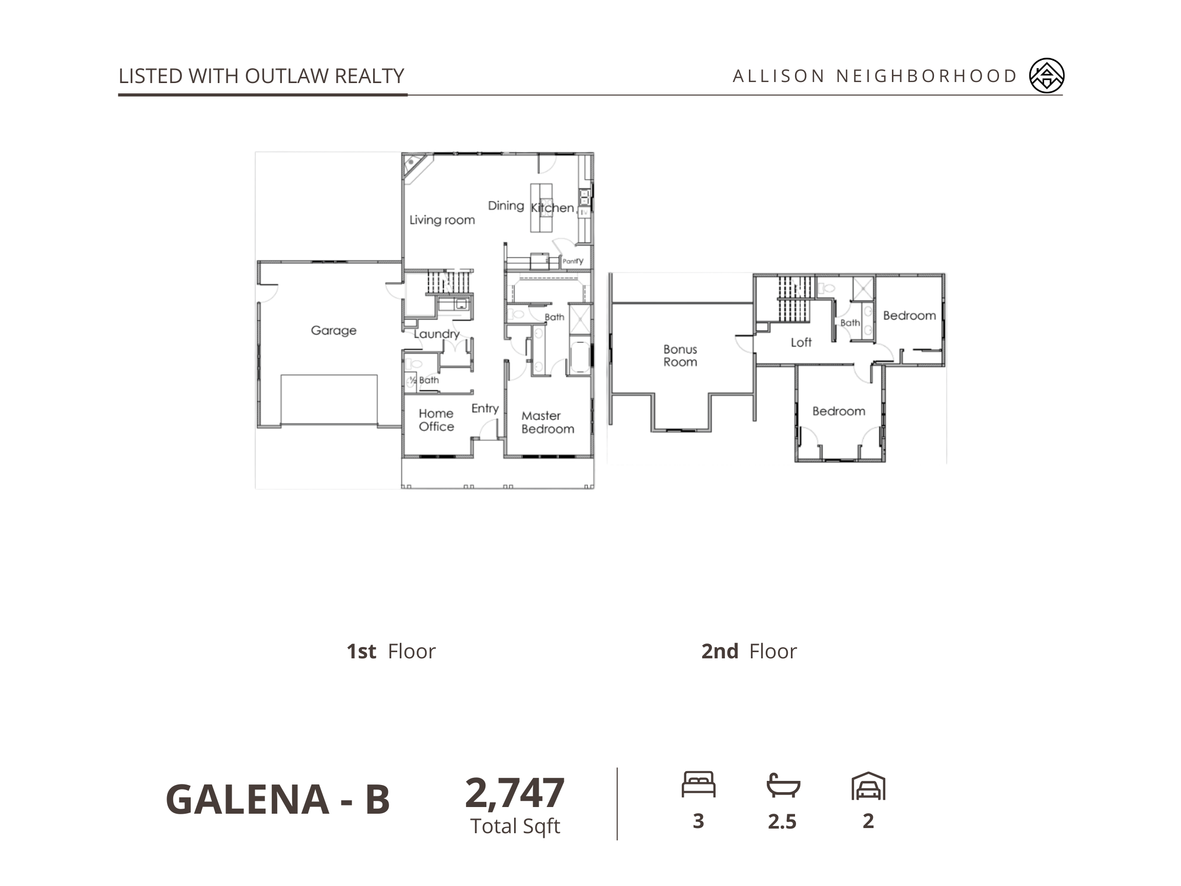 Lot #32Galena A offers an entryway home office, primary suite, two additional bedrooms, and a bonus room, with a spacious 3 car garage.